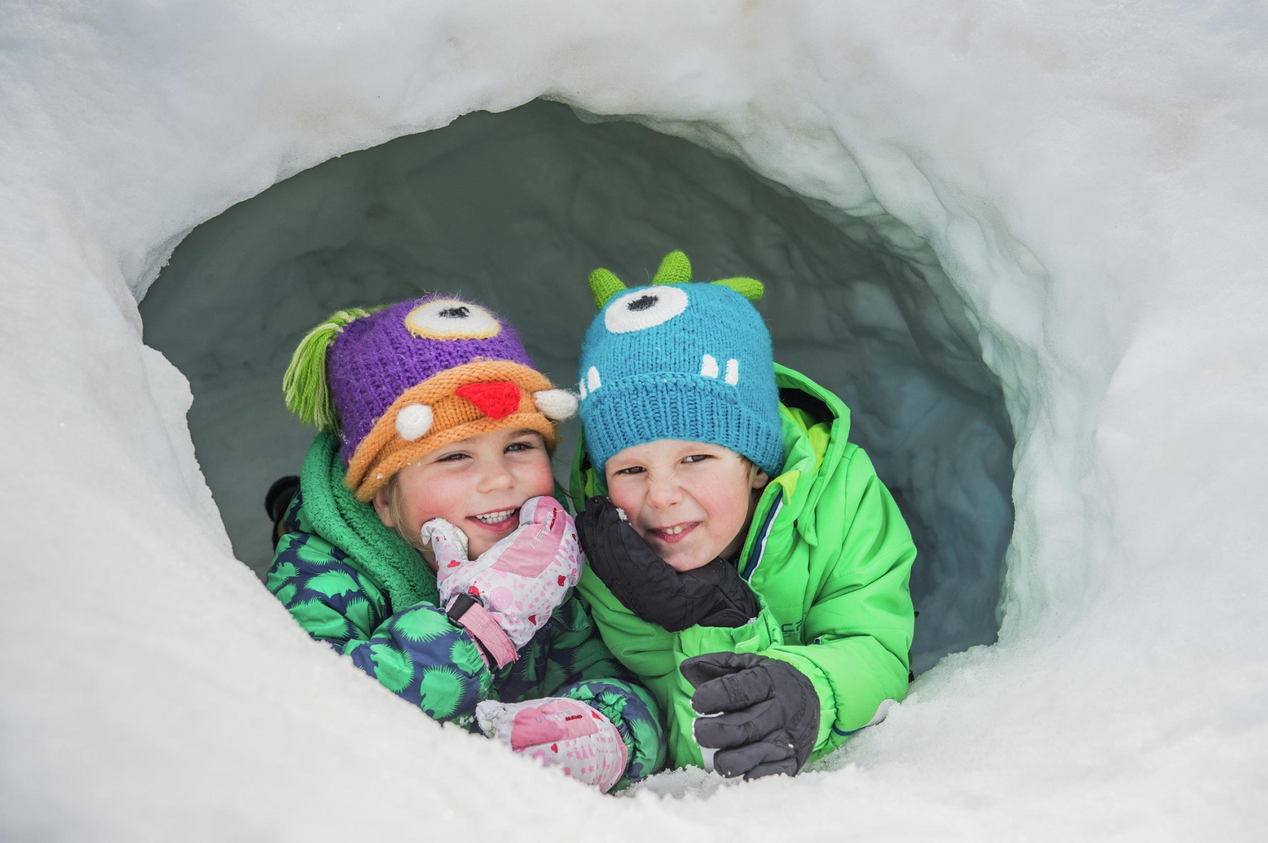 Children sledding joyfully in a snowy forest