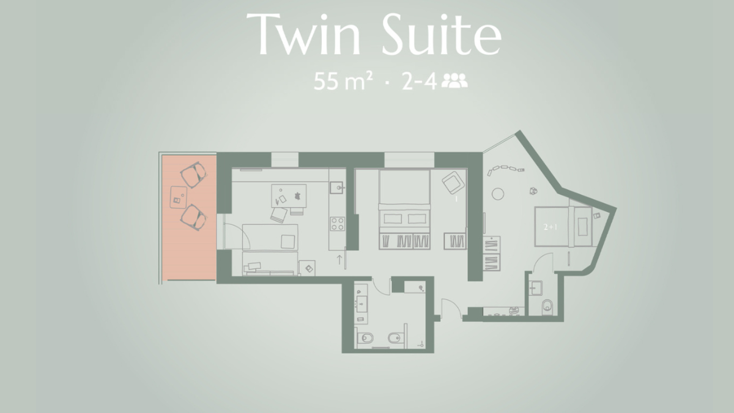 Simple design and warm elements such as wood and high-quality fabrics give the Smart Suite Green a cozy feel-good atmosphere. The separate bedroom with a large bunk bed for two or three additional sleeping places provides enough privacy. Completely restyled in Decembre 2022.