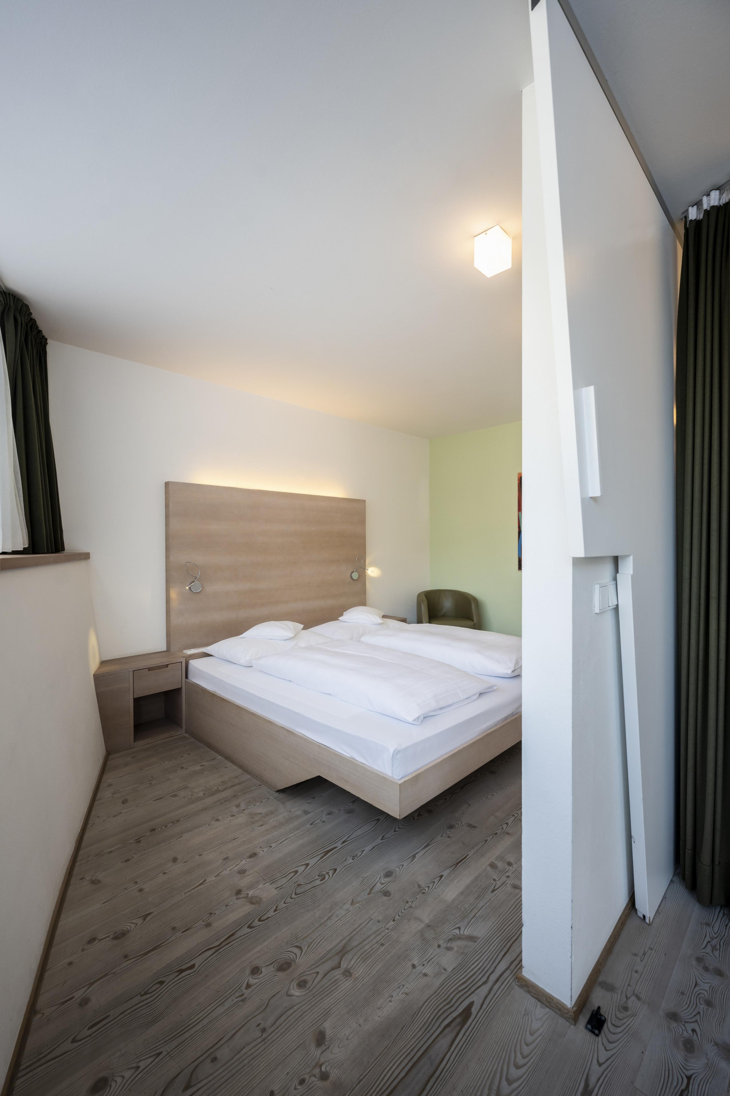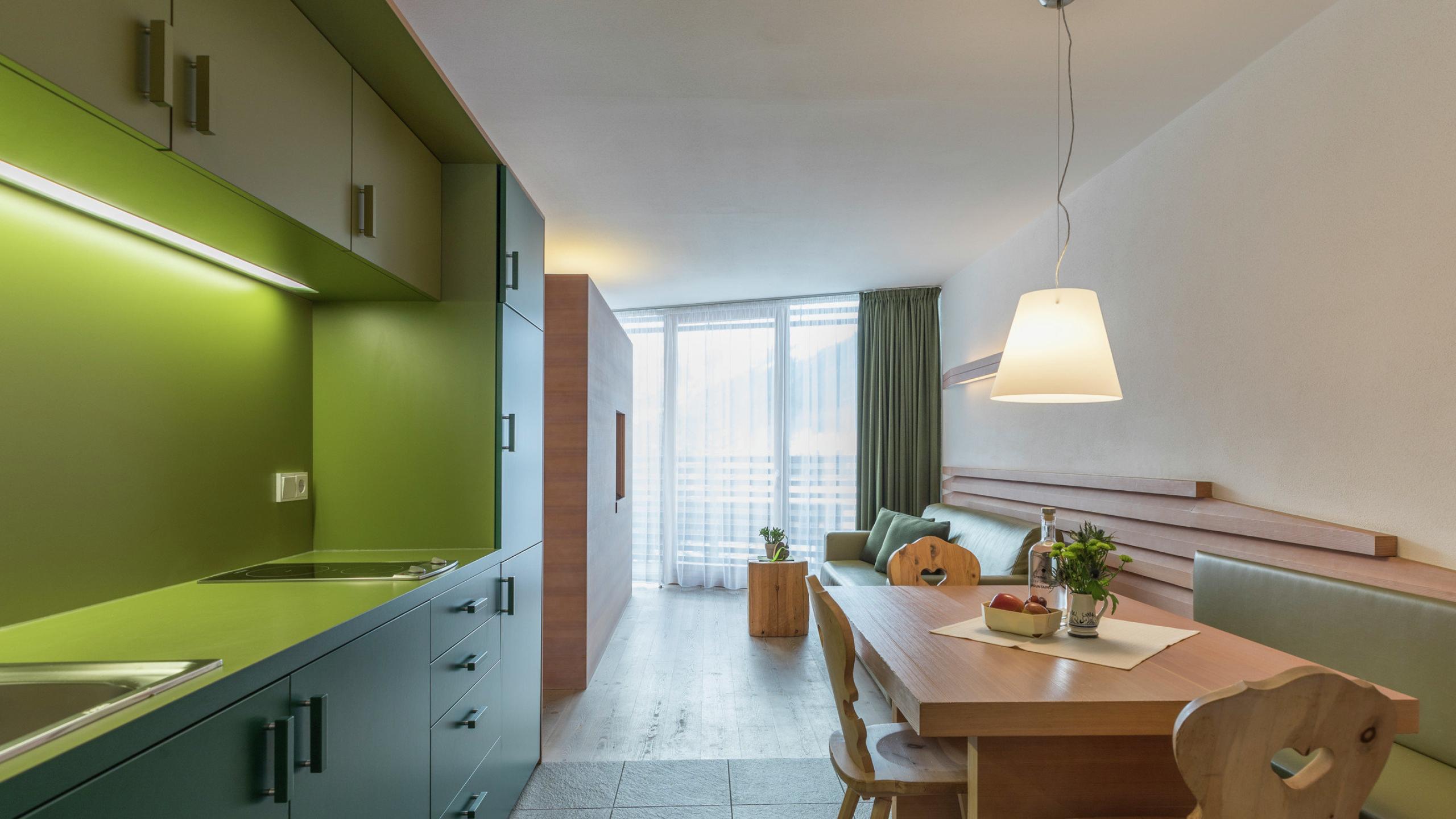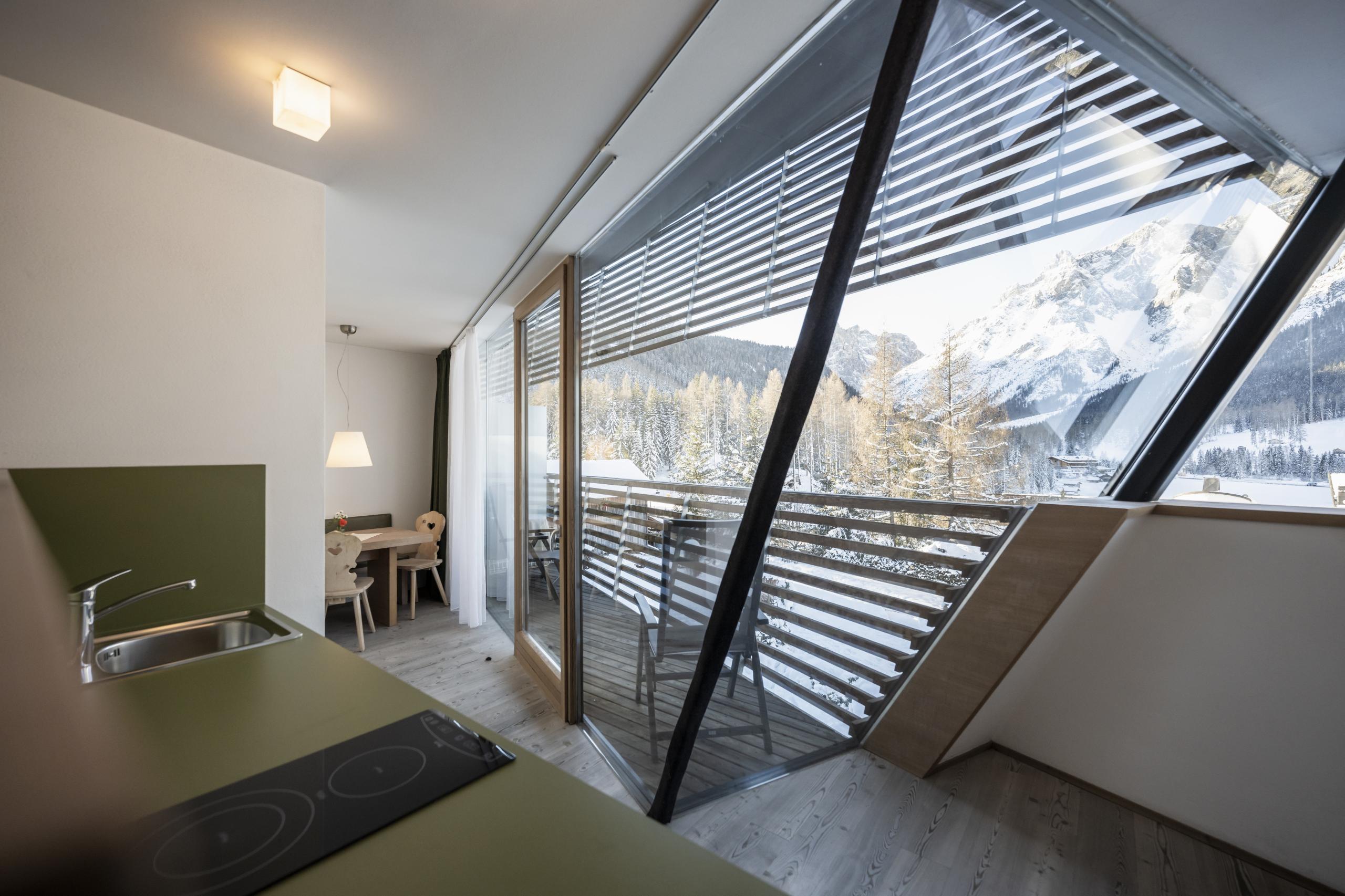 Modern flat with floor-to-ceiling panoramic window and view of the garden and Sesto Dolomites